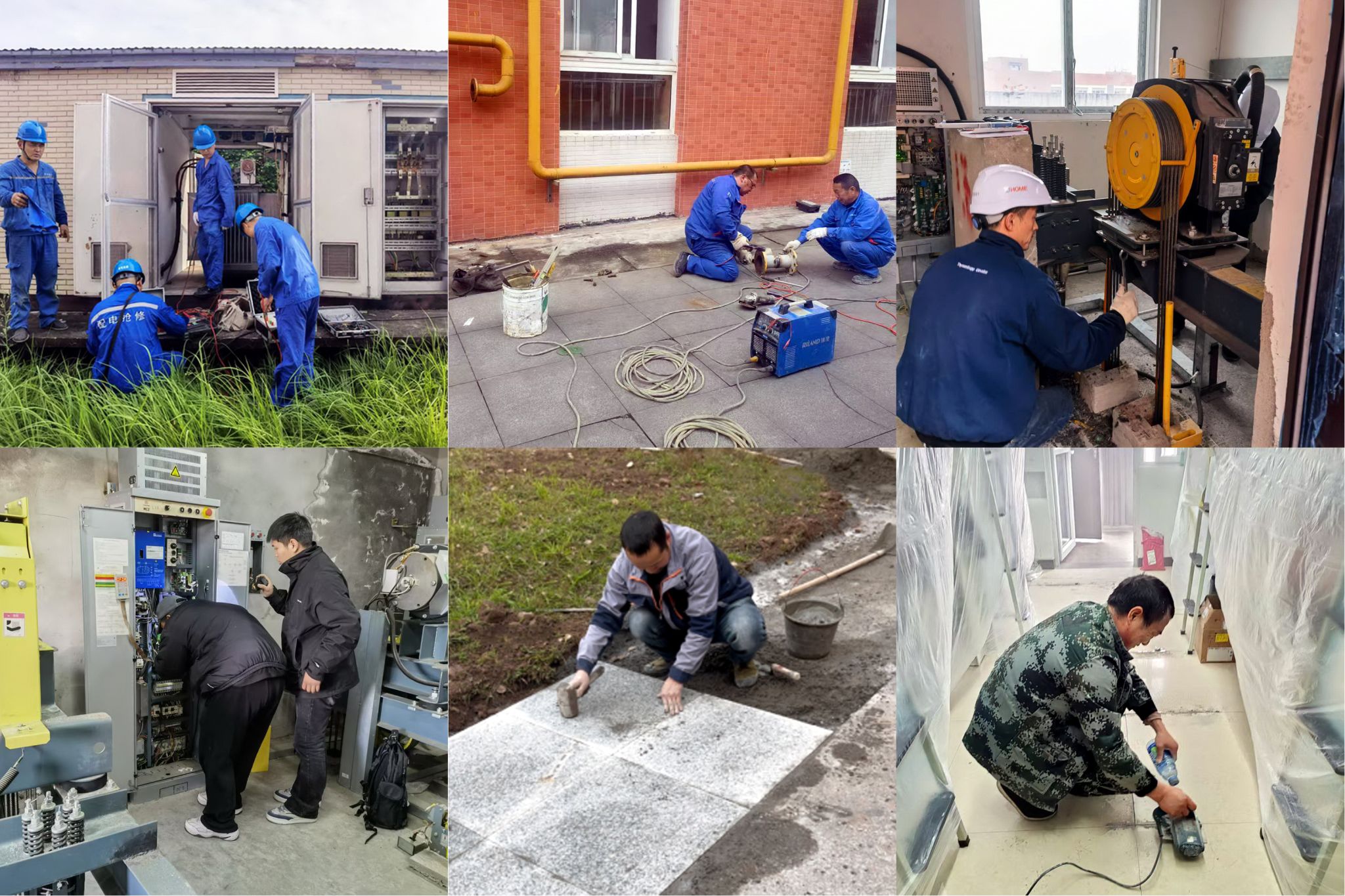 检查并维修维护校园剥落的墙面、破损的路面、脱落的瓷砖,组织对高压配电、电梯设备进行维护保养,联系燃气公司对学校燃气安全使用做全面检查,维修维护锈蚀的燃气管道。