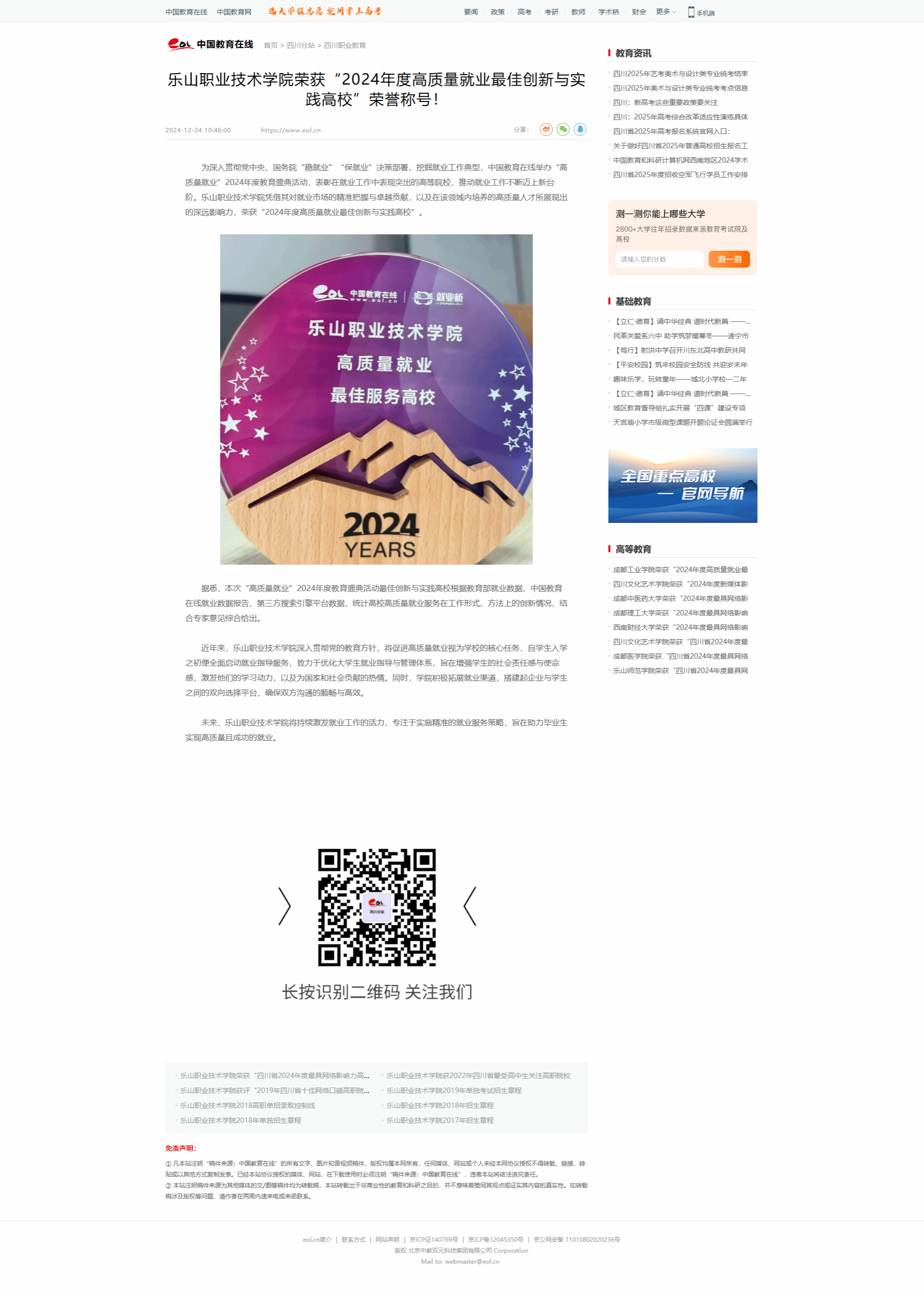 中国教育战线:乐山职业技术学院荣获“四川省2024年度最具网络影响力高职院校”