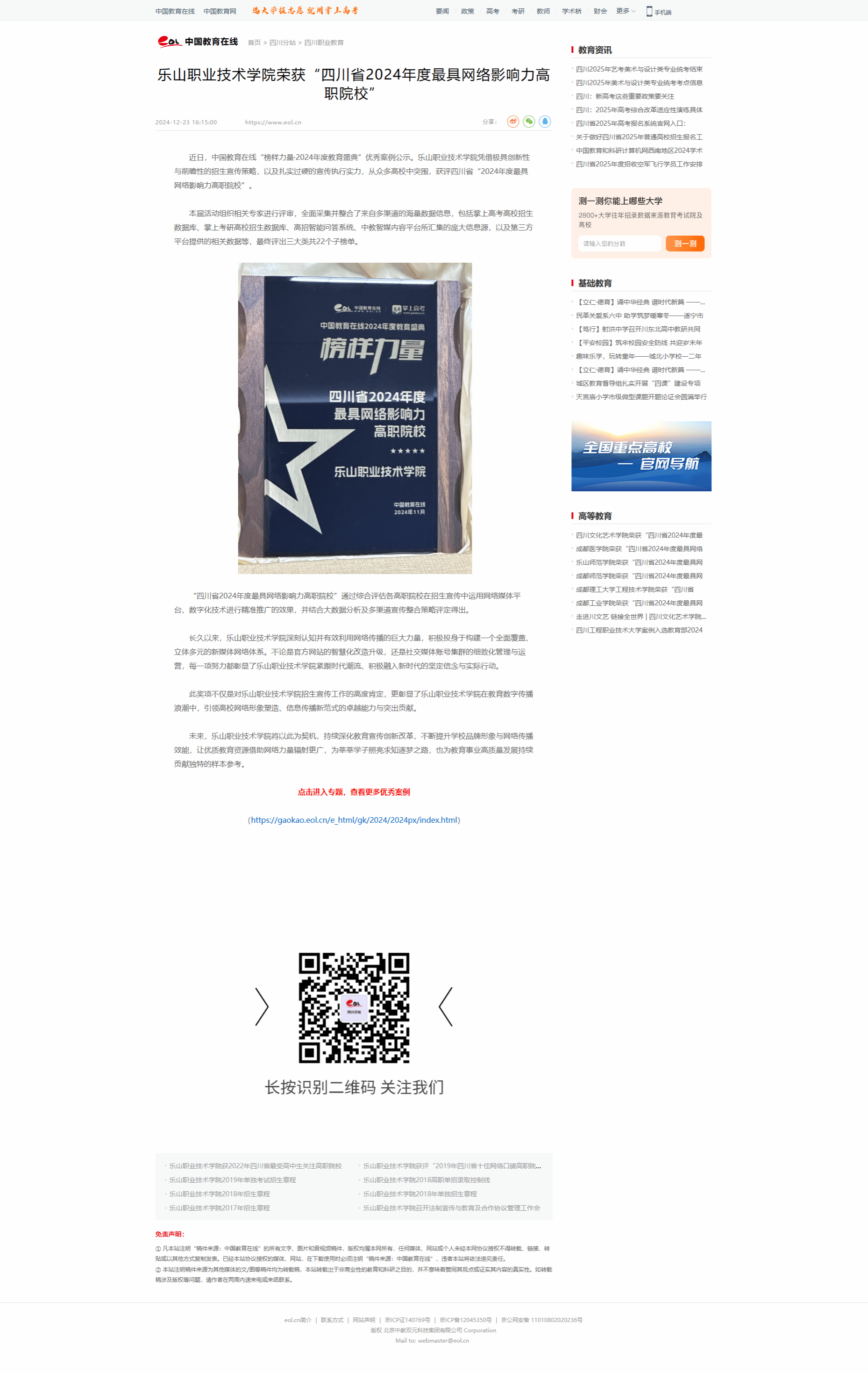 中国教育战线:乐山职业技术学院荣获“四川省2024年度最具网络影响力高职院校”-尊龙凯时人生就是搏